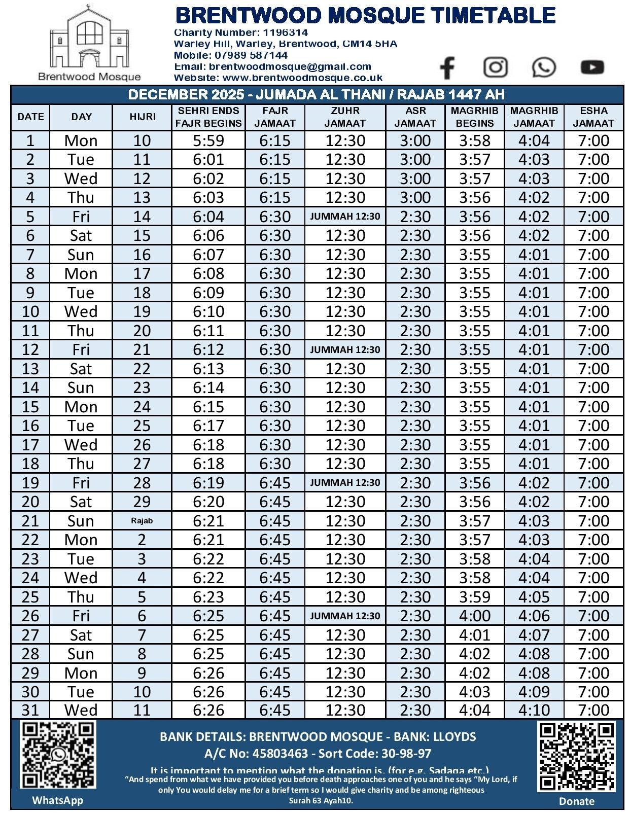 PLEASE NOTE THAT THE MOSQUE OPENS 15 MINUTES BEFORE SALAT AND CLOSES IMMEDIATELY AFTER